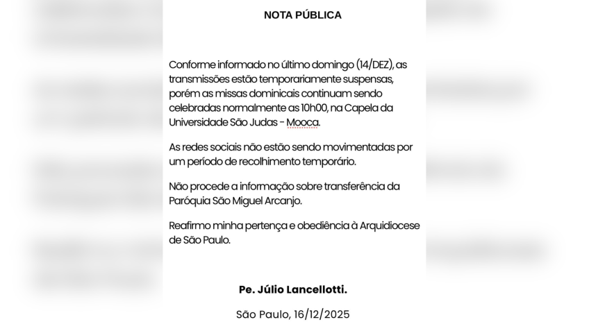 O sacerdote também confirmou que deixará de utilizar suas redes sociais, que não recebem novas publicações há cerca de seis dias. Segundo nota divulgada pela Paróquia São Miguel Arcanjo, a interrupção das transmissões e das postagens ocorre em razão de um “período de recolhimento temporário”.