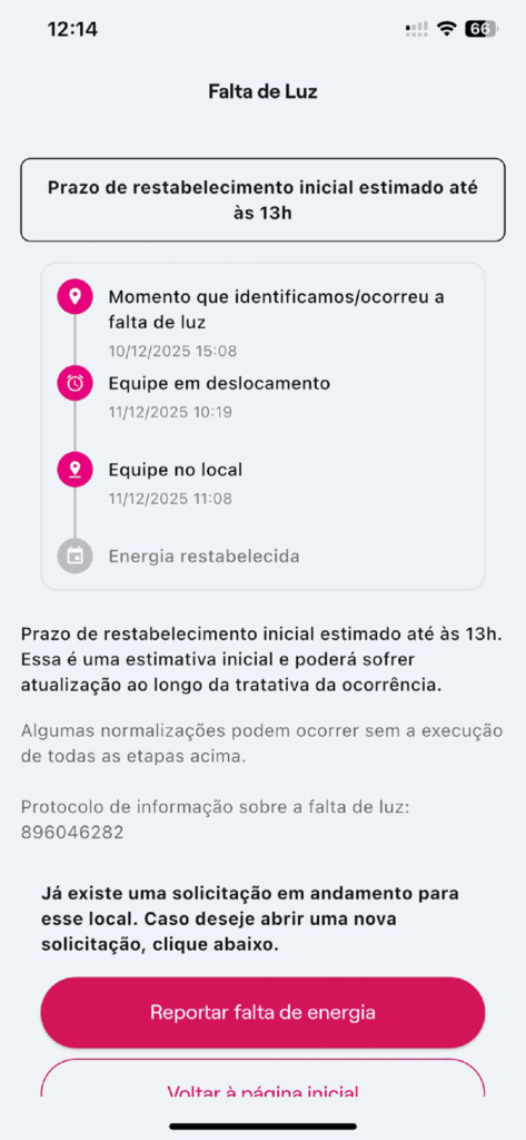Moradores relataram dificuldades em acessar o app da concessionária para consultar previsões de restabelecimento. Alguns disseram ter recebido horários diferentes em poucos minutos; outros não conseguiram fazer prints porque o sistema bloqueou a captura de tela.